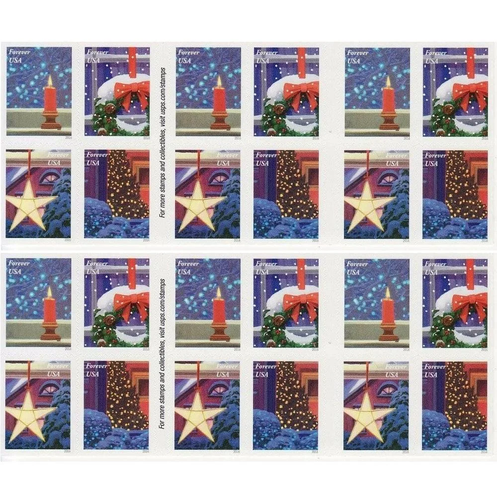 The 2016 Holiday Windows USPS Forever Stamps display festive designs for First Class Mail. These stamps retain forever postage validity.